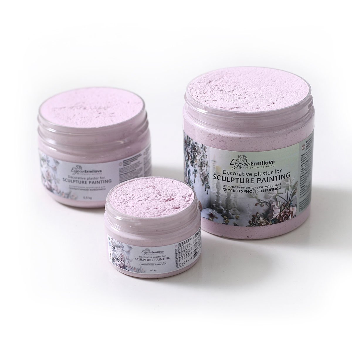 Tinted plaster for work in the author’s technique Evgenia Ermilova «Sculptural painting» color «Powder». Decorative plaster «Powder» has the most delicate pink- lilac hue. Plaster «Powder» in sculptural painting can be used to create very delicate colors: roses, lilacs, almonds, tulips, peonies, lilies, daisies, asters, irises, rhododendrons, and orchids. To create a harmonious color transition in the petals of the plaster color «Powder» can be combined with light shades of a pink and purple palette of the brand «Evgenia Ermilova». For example, with «Pink smoke», «Lavender Mist» or «Purple». The new color palette of decorative plaster got its name in honor of the famous cosmetic and delicate sweet ingredient of cooking. The cosmetic powder is created to emphasize women’s beauty, powdered sugar — to decorate culinary products, and decorative plaster «Powder» – to create elegant flowers in the paintings.